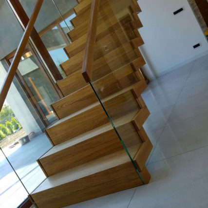 Galeria zdjęć przedstawia schody dywanowe wykonane z klejonki dębowej o grubości 90 mm. Struktura schodów szczotkowana i zabezpieczona naturalnym olejem. Balustrada na schodach i antresoli zrobiona została ze szkła hartowanego o grubości 10 mm wycinana w ZĄB.